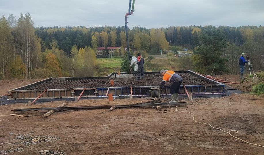 Новый объект — заливка фундаментной монолитной плиты. Мы оперативно доставили на стройплощадку в деревне Большое Андрейково 23 кубометра бетона марки B20 W4 F150