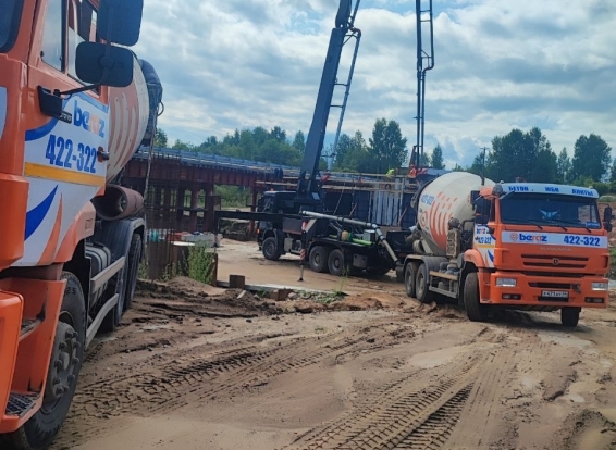 Главное условие успешной стройки — своевременная доставка стройматериалов. Мы обеспечиваем бесперебойный подвоз бетона для заливки мостовых опор. Работы впереди ещё немало!